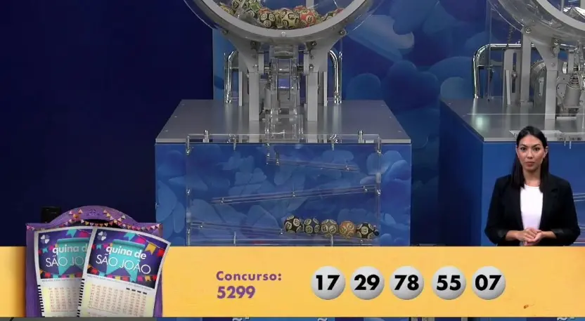 O sorteio da Quina de São João, concurso 5299, realizado na noite deste sábado (27), no Espaço Loterias Caixa, em São Paulo, sorteou os números 17 – 29 – 78 – 55 – 07.