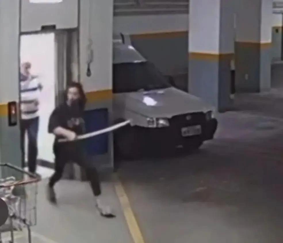 As imagens registram o momento em que o fisioterapeuta desce, junto ao síndico, até o estacionamento do prédio. É neste momento que ele começa a perseguir os suspeitos com a katana japonesa em mãos. Ninguém se feriu e as bicicletas foram abandonadas.