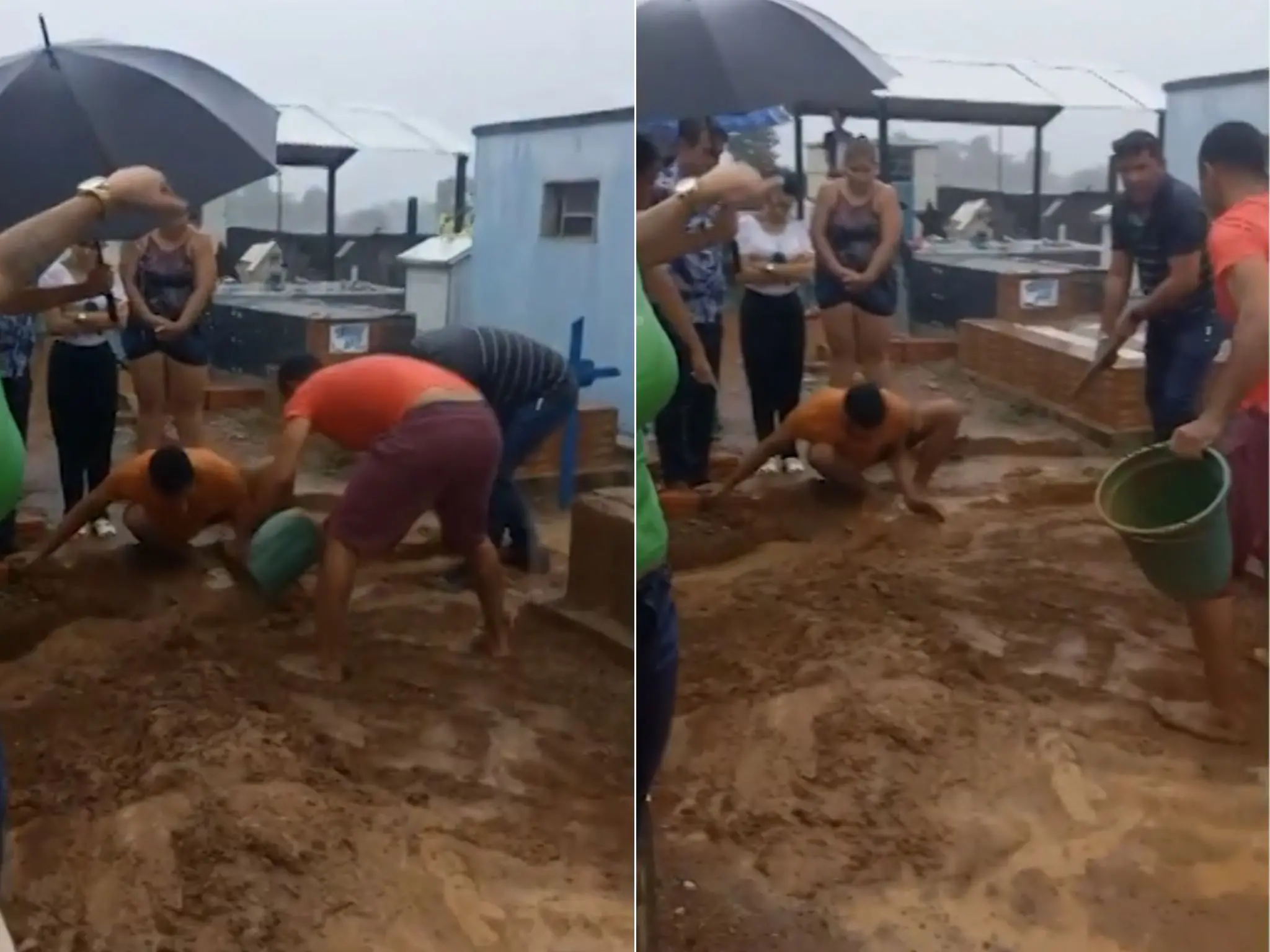 Em um vídeo que circula nas redes sociais, é possível ver os familiares da idosa movimentando areia sob forte chuva. "Tem mais de meia hora que nós estamos empurrando terra com a mão e com os pés aqui para poder terminar o funeral de um ser humano. Não é animal não, é ser humano, digno", diz uma das familiares no registro.