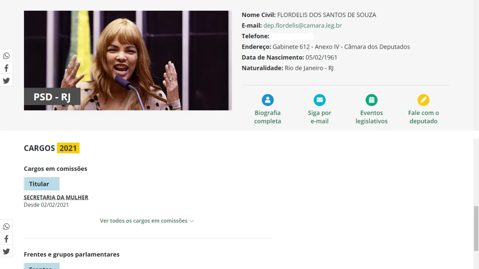 A deputada federal Flordelis dos Santos (PSD) é apontada, em seu perfil no site da Câmara dos Deputados, como titular na Secretaria da Mulher da casa legislativa. Entretanto, a parlamentar esclareceu, em uma nota publicada nas redes sociais nesta quarta-feira (3), que a informação não está correta.