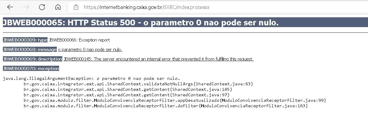 Usado para transações financeiras virtuais, o internet banking encaminha o usuário para uma página que reconhece um "erro interno" encontrado pelo servidor.