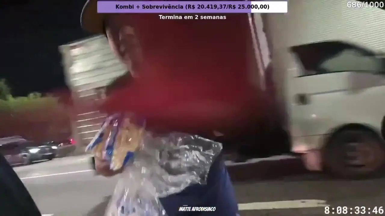 Renato estava em um carro acompanhado do primo dele. Em determinado momento da transmissão, ele para em um sinal e é abordado por dois vendedores ambulantes. Um deles tenta vender um pacote de polvilho por R$ 2.