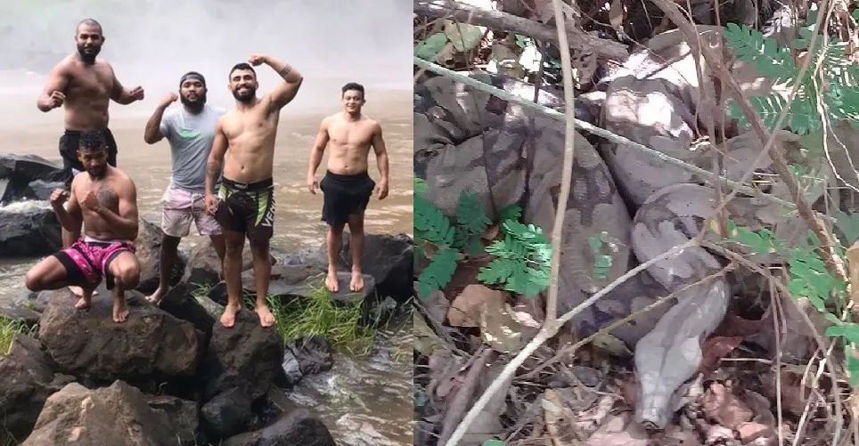 Sucuri gigante é encontrada por lutadores de MMA durante passeio em cachoeira; veja vídeo