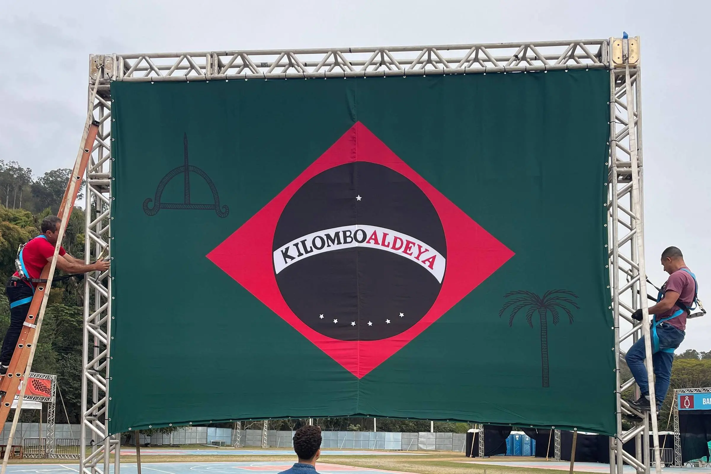 Uma releitura da bandeira do Brasil foi alvo de censura, nesse sábado (26), no Festival Sesc de Inverno, realizado em Petrópolis, região serrana do Rio de Janeiro. Assinada pelo artista Matheus Ribs, a obra substitui a expressão "Ordem e Progresso" por "KilomboAldeya". Além disso, ao invés de verde e amarelo, estampa as cores vermelho e preto.