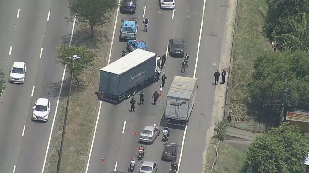 Suspeitos usam caminhões para fechar Avenida Brasil durante operação policial no RJ