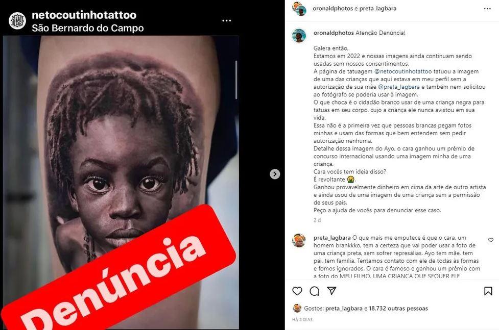 O tatuador Neto Coutinho, de São Paulo, é denunciado por usar, sem autorização dos pais, a foto de uma criança negra para tatuar um cliente. O caso se tornou público após o profissional ganhar dois prêmios por conta da tatuagem durante a convenção "Tattoo Week", realizada em outubro. As informações são do portal g1.