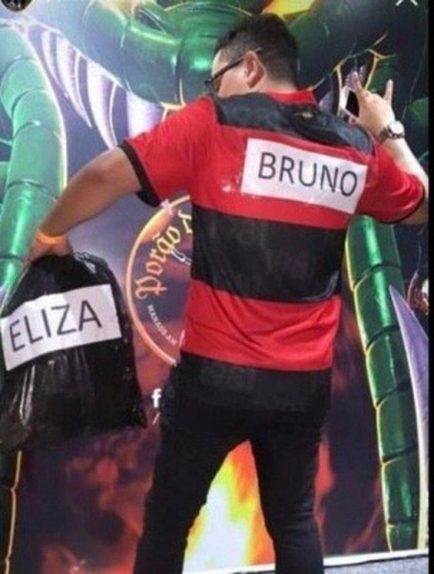 Homem vestiu camisa do flamengo e segurou saco de lixo com o nome da modelo morta pelo atleta