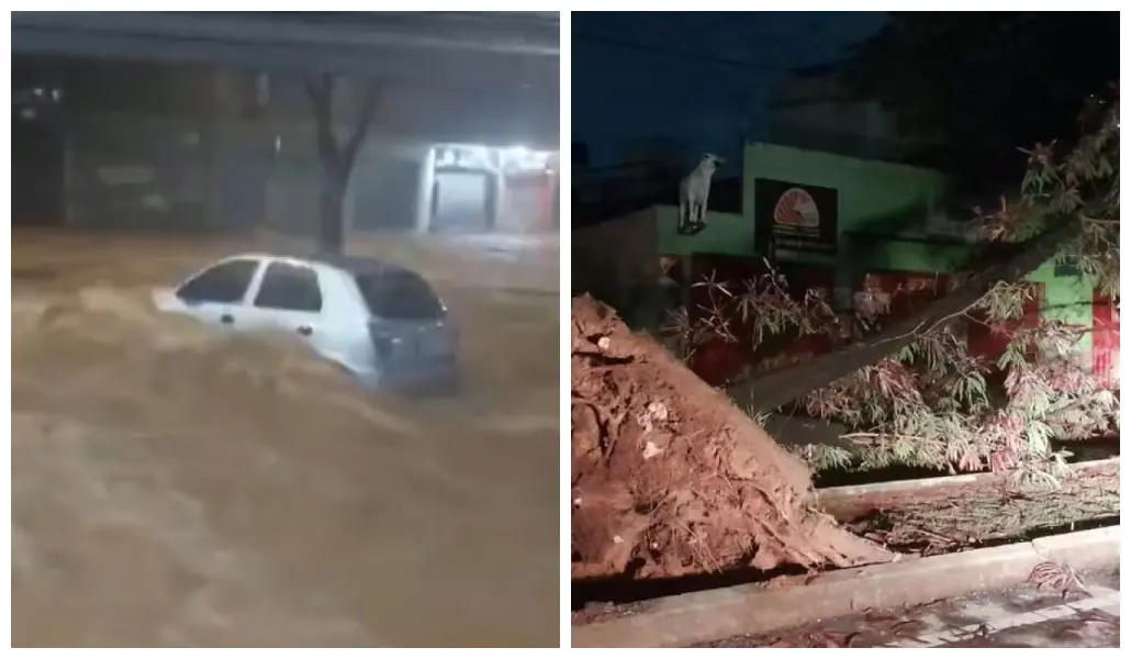 Um temporal, acompanhado de raios e rajadas de vento, alagou ruas, derrubou árvores e arrastou carros, na noite deste sábado (26) em Belo Horizonte (MG). A força da enxurrada arrancou o asfalto em ruas e avenidas, e bairros ficaram sem luz.