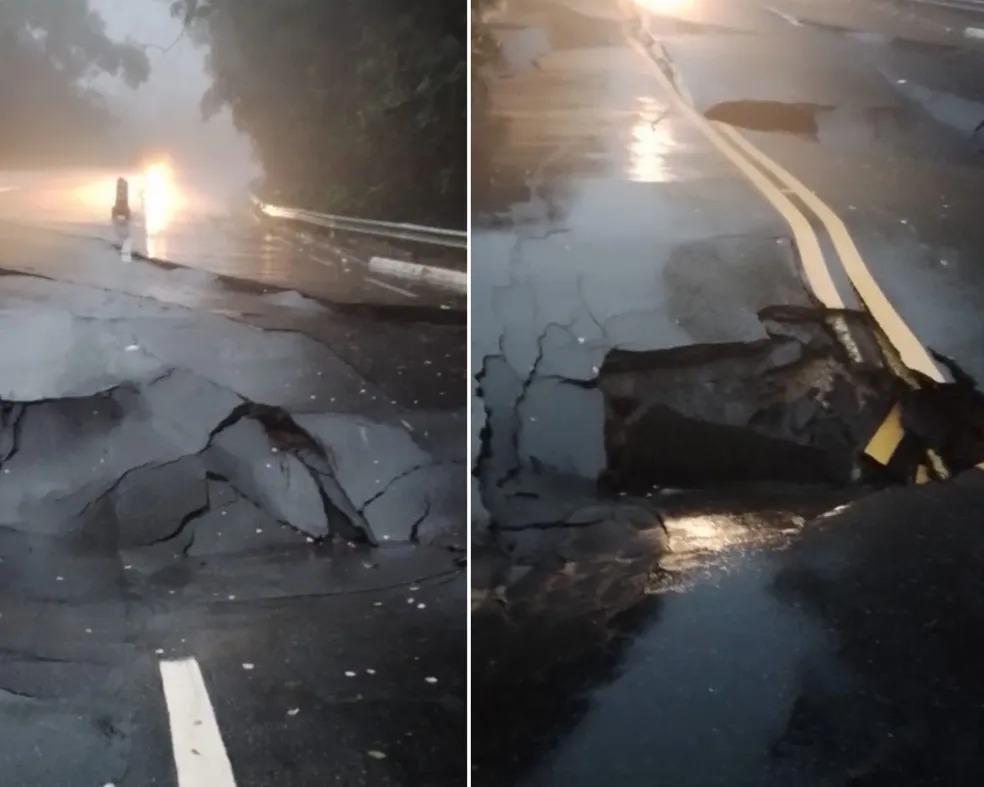 Legenda: Rodovia fica interditada após asfalto ceder na Baixada Santista