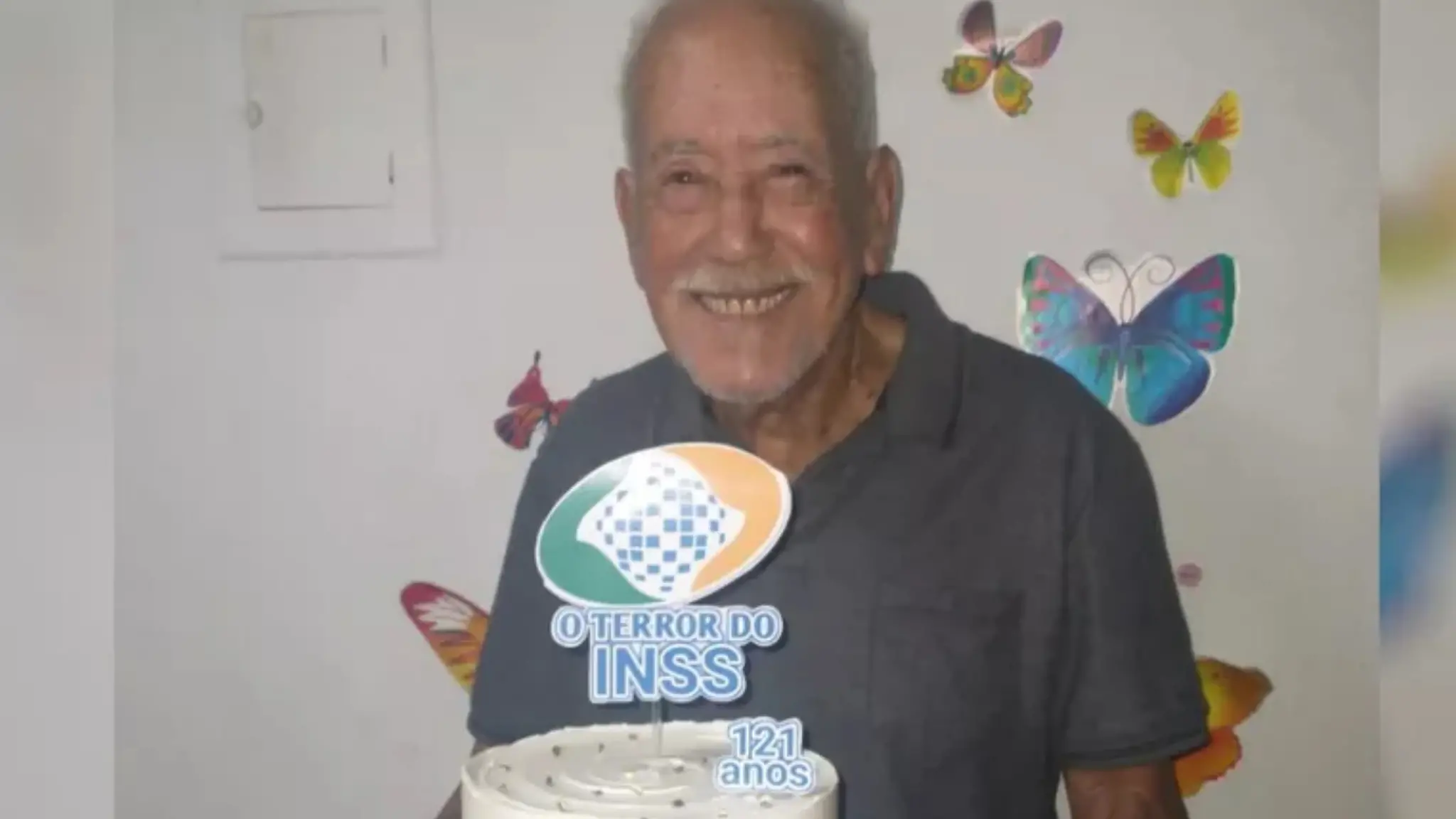 O aposentado Andrelino Vieira da Silva completou 121 anos e ganhou um bolo temático em Aparecida de Goiânia, Goiás. Uma das netas dele, a supervisora contábil Janaina Lemes de Souza, de 36 anos, escolheu a frase "O Terror do INSS" para enfeitar o doce e comemorar da data ao lado do avô centenário. As informações são do portal G1.