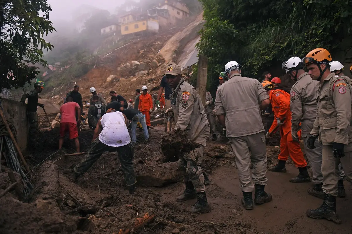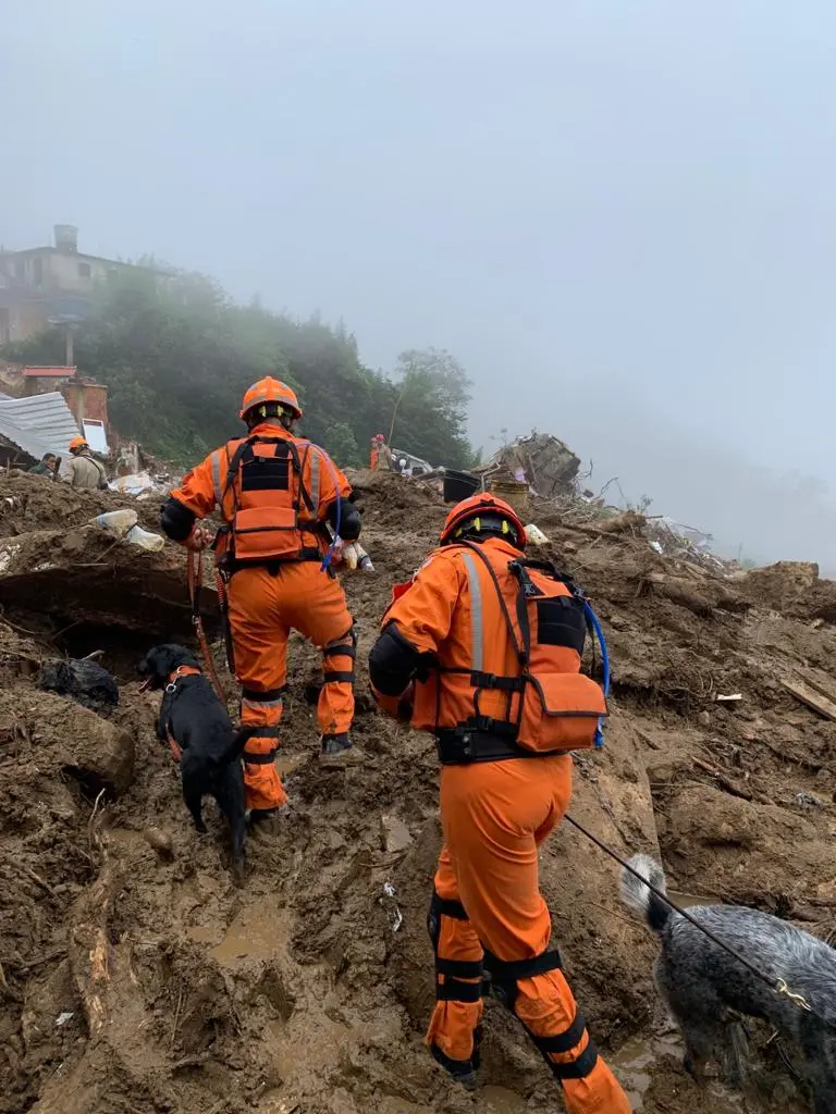 As equipes de busca especializadas têm se dividido em três áreas principais, mesmo com a chuva, que atrapalha o esforço de resgate e aumenta o risco de novos deslizamentos.