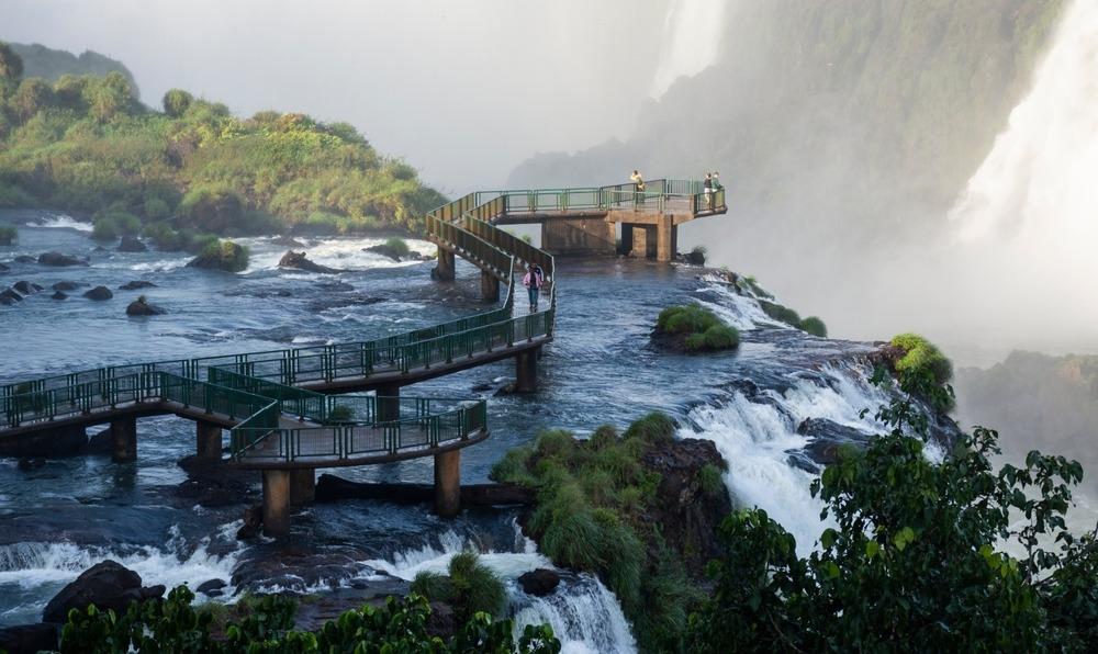 Os espaços para ver as Cataratas do Iguaçu, no Brasil e na Argentina, são protegidos por estruturas como cercas, parapeitos e grades.