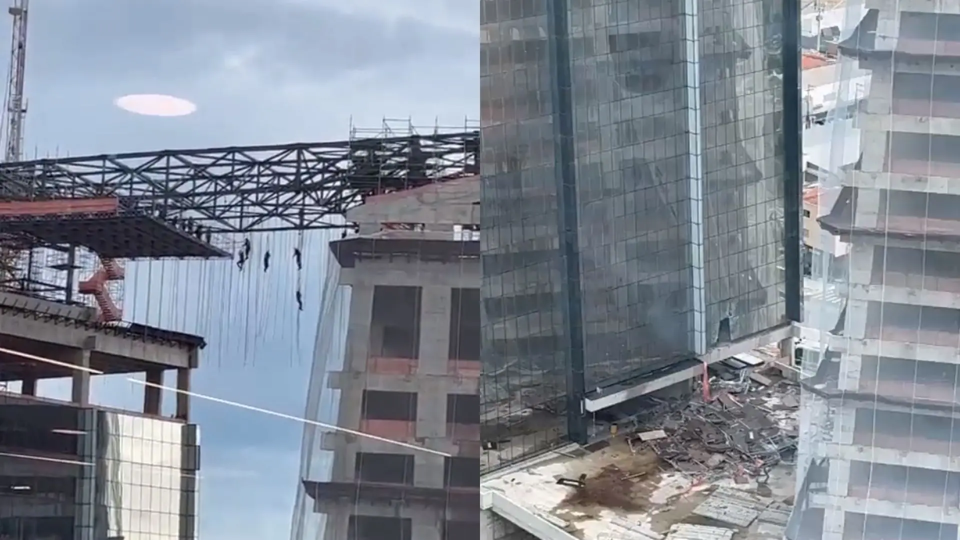 Operários ficam pendurados no topo de prédio em SP após parte da estrutura cair