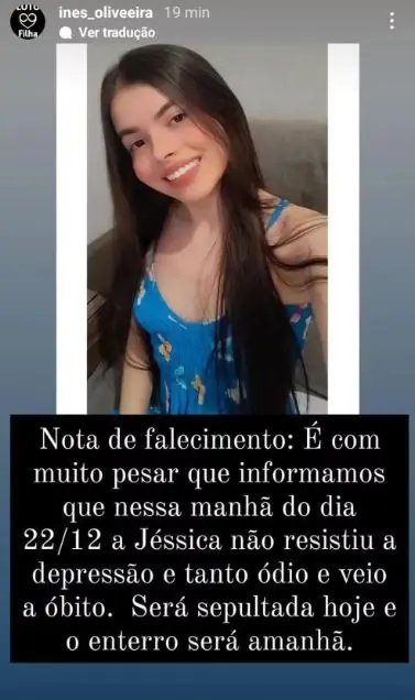 A morte da jovem foi confirmada pela própria família por meio do perfil da mãe, Inês Oliveira. "Nota de falecimento: É com muito pesar que informamos que nessa manhã do dia 22/12 a Jéssica não resistiu a depressão e tanto ódio e veio a óbito. Será sepultada hoje e o enterro será amanhã", disse o comunicado.