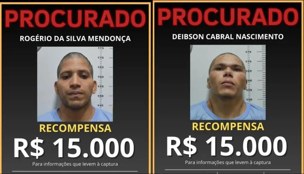 Os dois homens, que fugiram de uma unidade federal de segurança máxima, são caçados por uma força-tarefa de 600 policiais desde o último dia 14 de fevereiro. Até então, os paradeiros dos integrantes de uma facção criminosa do Rio de Janeiro são desconhecidos e a Polícia Federal oferece recompensa de R$ 15 mil por informações sobre cada um dos fugitivos.