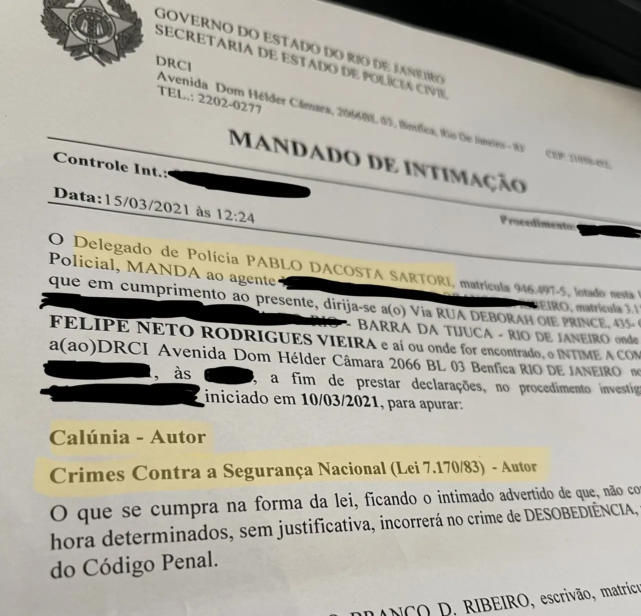A defesa de Felipe Neto alega que houve irregularidade na condução da investigação pela Polícia Civil do Rio, pois tal competência seria da Polícia Federal. Conforme o delegado Pablo Sartori, a investigação foi aberta por ele porque se trataria de um crime cometido contra a honra, previsto no Código Penal e na Lei de Segurança Nacional.