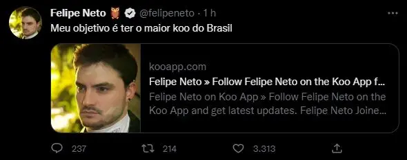 "Meu objetivo é ter o maior Koo do Brasil", escreveu Felipe Neto, em um tuíte que conseguiu mais de cinco mil curtidas em pouco menos de uma hora.