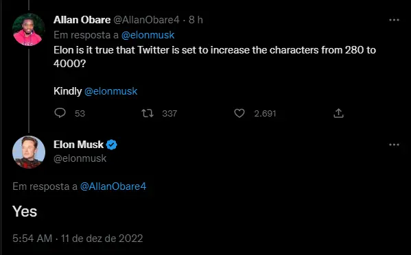 O Twitter deve aumentar o limite de caracteres por publicação de 280 para 4 mil toques. A mudança foi anunciada pelo CEO da companhia, Elon Musk, em resposta a uma usuária da rede social neste domingo (11).