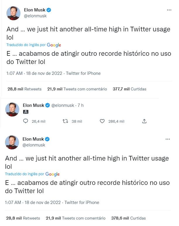 Em outros tuítes, o novo proprietário da plataforma publicou a bandeira da morte e as frases "deixe isso afundar" e "acabamos de atingir outro recorde histórico no uso do Twitter".