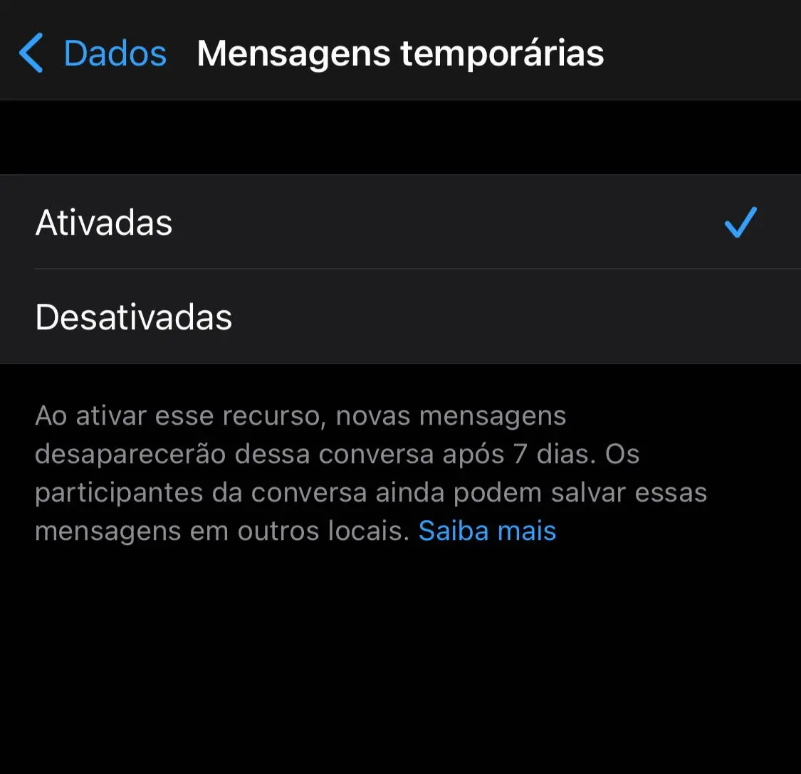 Para isso, escolha o chat desejado no aplicativo. Toque em "Mensagens temporárias" e, se preciso, em "Continuar". Depois, selecione "Ativadas".