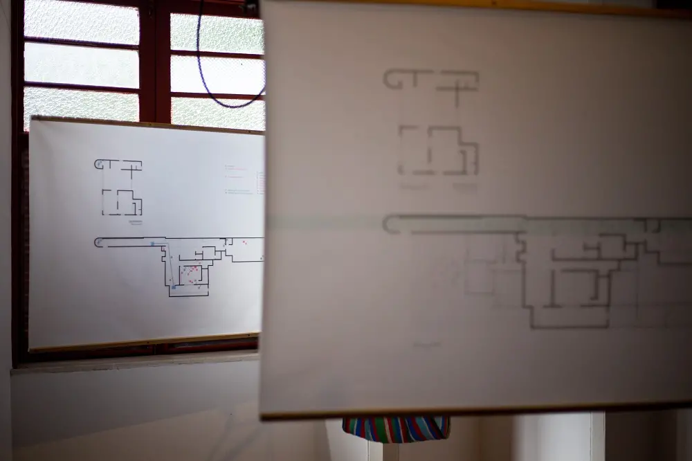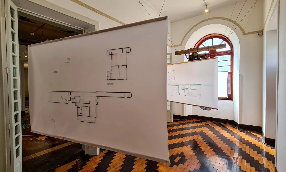 “A instalação traz à tona uma discussão sobre o espaço, de como a gente o constrói de maneira subjetiva, uma vez que as plantas baixas – apesar de serem um código usado na Arquitetura – compõem a instalação trazendo muito mais a localização de invenções do que elementos construtivos em si”.