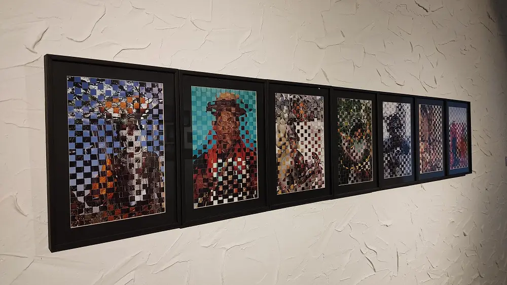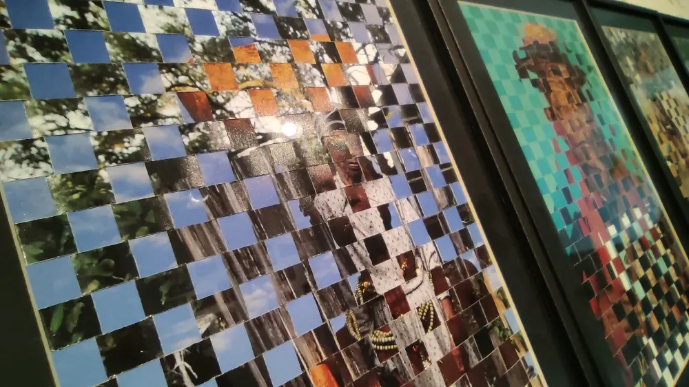 Para a série “Tecituras”, ele começou a pesquisar a possibilidade de criar colagens sem utilizar a cola. “O que eu fiz? Peguei imagens do século passado e juntei com imagens mais atuais. Assim, na feitura de cada peça que compõe a série, fui fazendo recortes bastante precisos, na horizontal e na vertical, criando entrelaçamentos entre essas duas imagens – as do passado e as de hoje”, dimensiona.