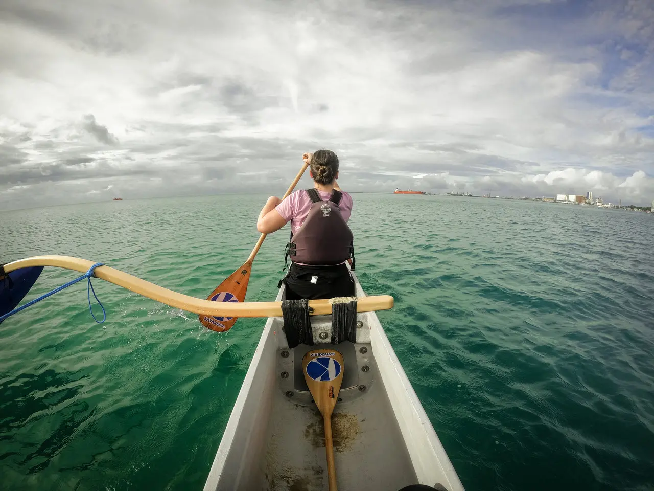 Depois, é hora de empurrar o equipamento para o mar e subir na canoa. É preciso ficar atento aos comandos dos instrutores na hora de remar, porque os movimentos devem ser sincronizados. Quando você pega o jeito, é só apreciar.
