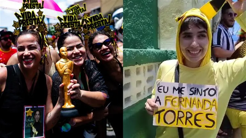 Às 10h, na Rua Paulino Nogueira, um grupo de 12 amigas saiu em cortejo com adornos na cabeça estampando a icônica frase da atriz de "Ainda Estou Aqui", dada no dia em que foi indicada ao Oscar.