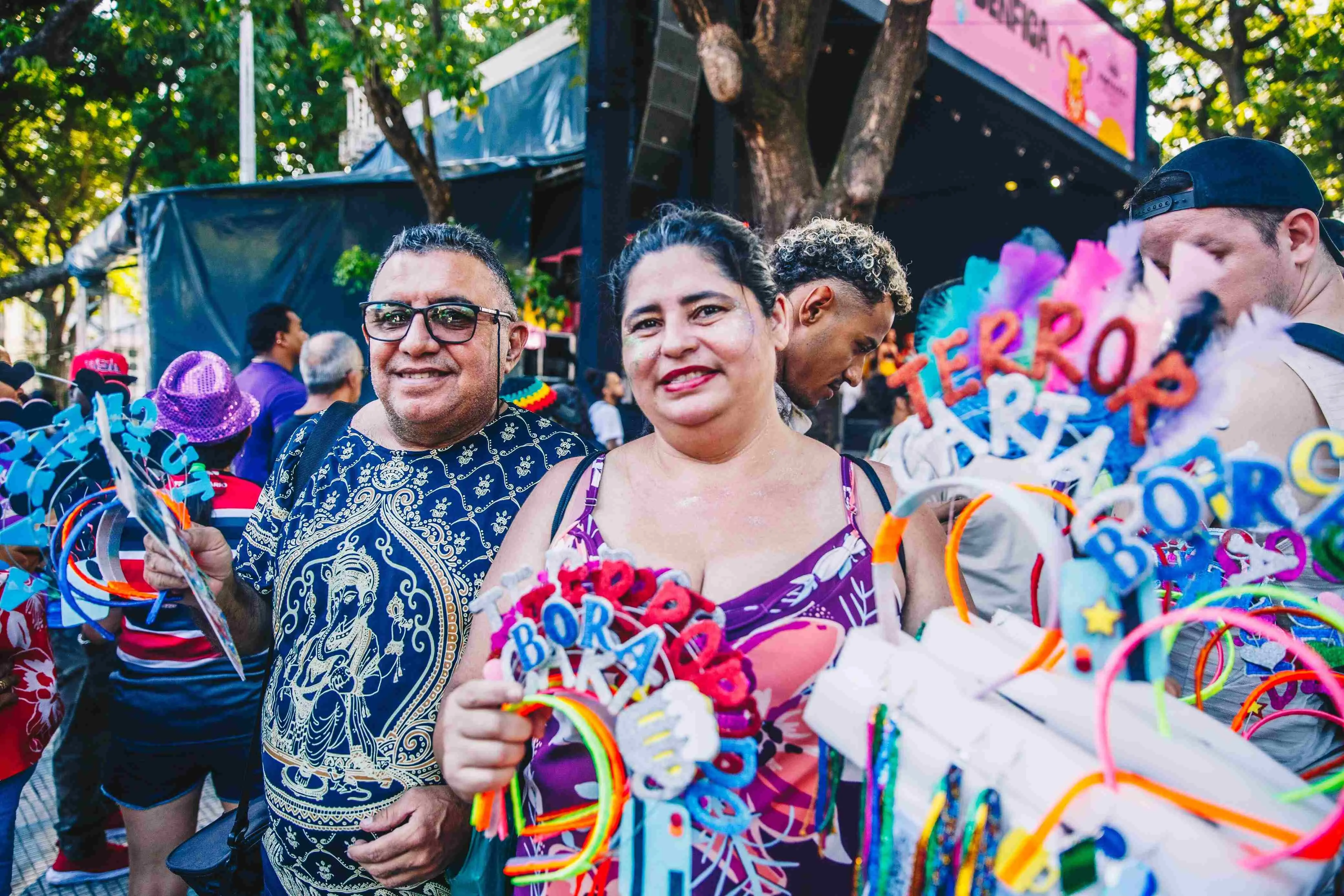 O caminhoneiro Milton Silva e a artesã Malu Bernardo usaram a criatividade e começaram a produzir e vender tiaras decoradas nos polos carnavalescos da Capital, de preferência, o do Benfica. "Bora beber", "terror do cartão" e "surtada" são expressões recorrentes nas composições, feitas em E.V.A. e com muito glitter e fitas.