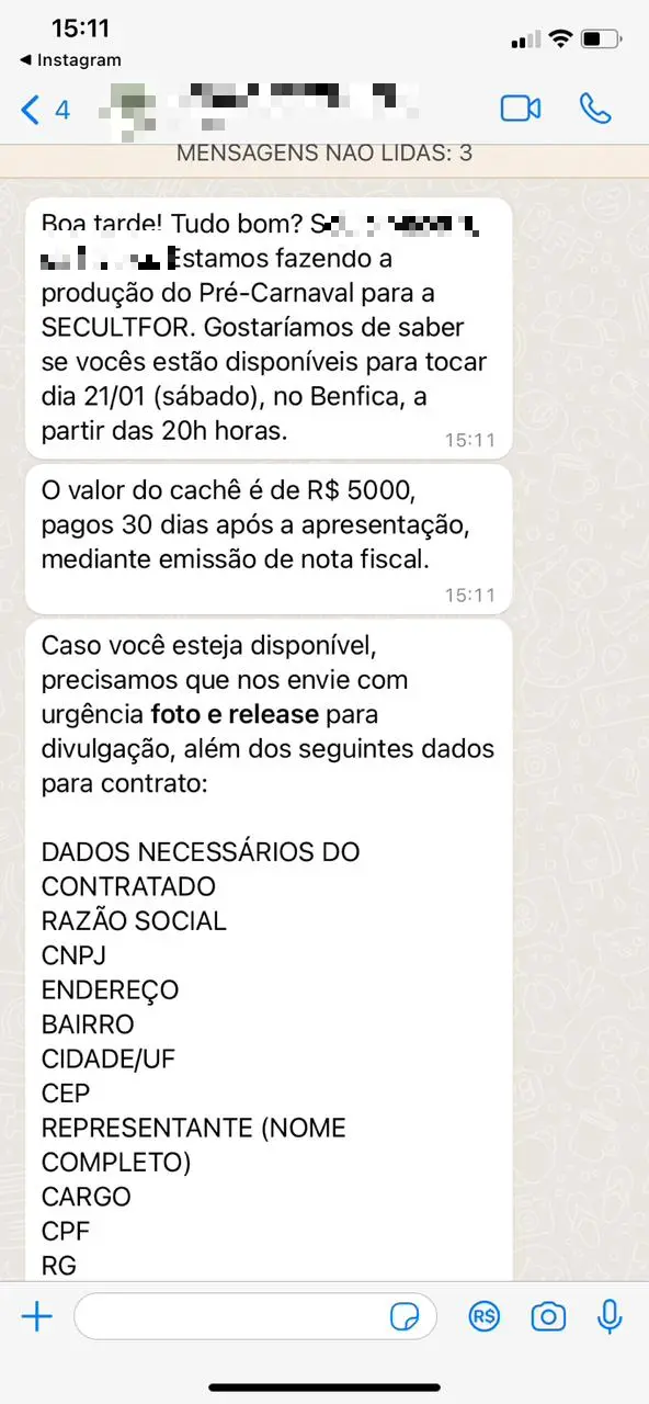 De acordo com os artistas, o valor oferecido de cachê pela produtora nesta semana foi de R$ 5 mil, o que não consta no edital.