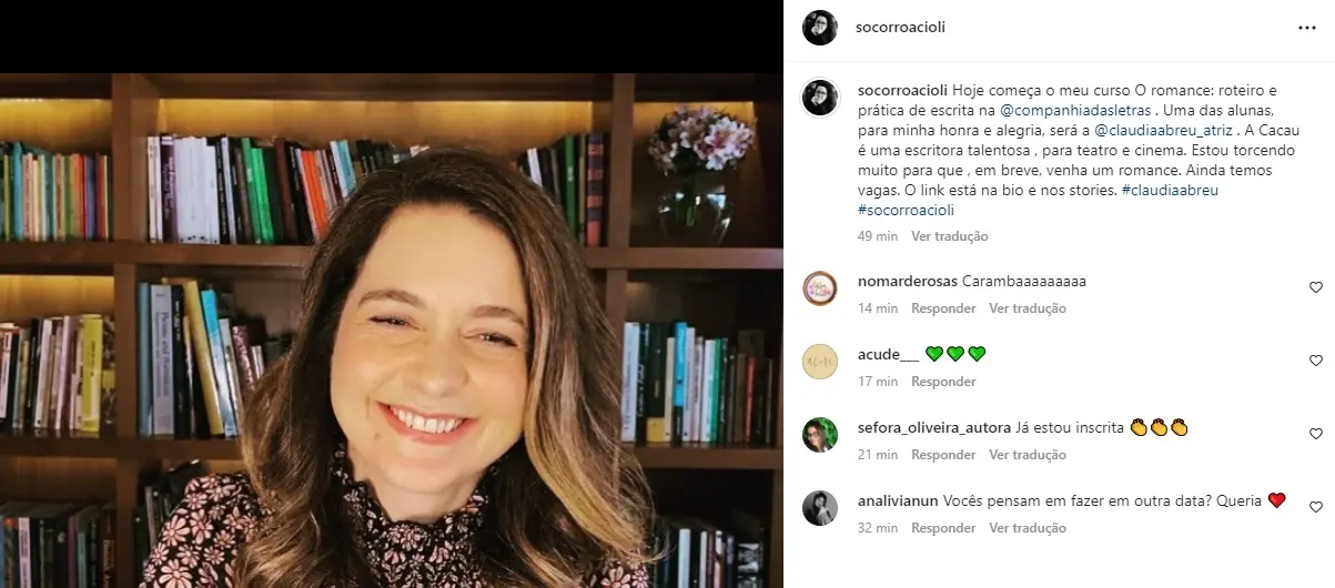 Nas redes sociais, Socorro Acioli festeja a presença de Cláudia no curso. "Uma das alunas, para minha honra e alegria", mencionou. "A Cacau é uma escritora talentosa, para teatro e cinema. Estou torcendo muito para que, em breve, venha um romance".