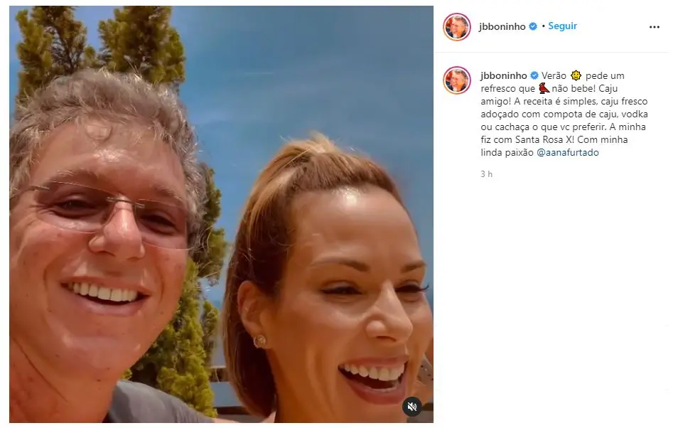 "Verão pede um refresco que passarinho não bebe! Caju amigo! A receita é simples, caju fresco adoçado com compota de caju, vodka ou cachaça, o que você preferir. A minha fiz com Santa Rosa X! Com minha linda paixão", diz a mensagem publicada no Instagram. No post, Boninho aparece bebendo caipirinha com a mulher, a apresentadora Ana Furtado.