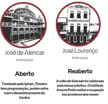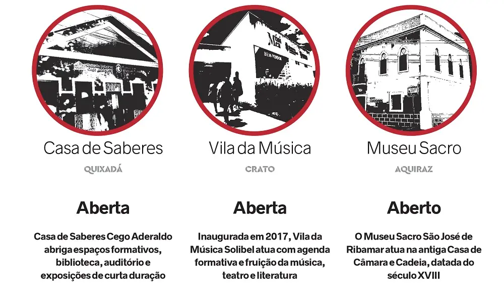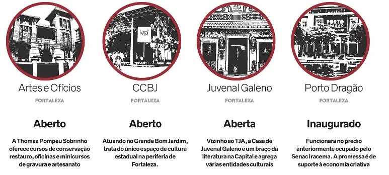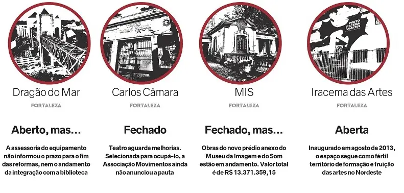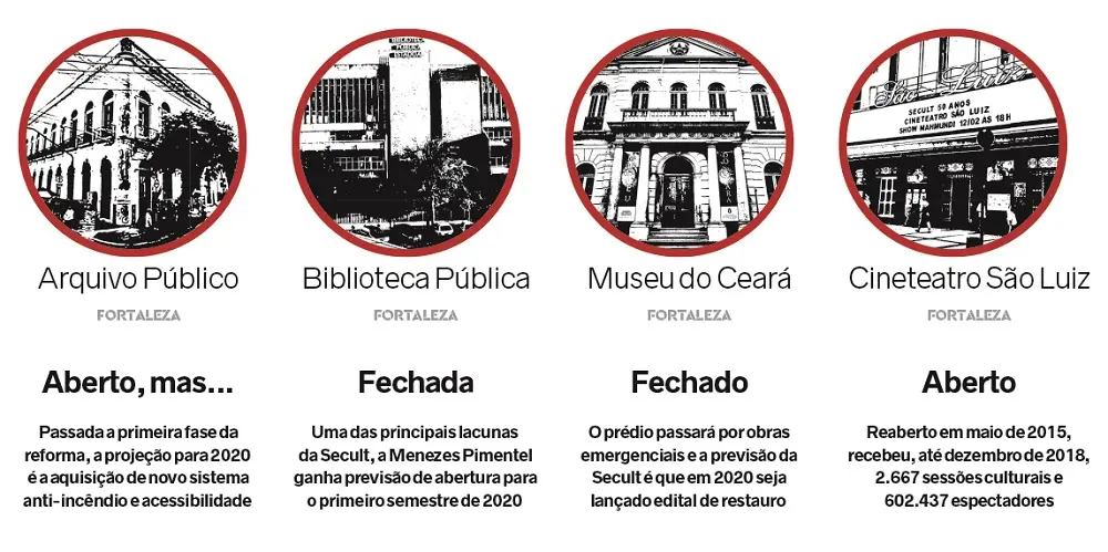 Em todo o Estado, a Secult administra 18 equipamentos. Desses, quatro encontram-se fechados. Além da Biblioteca Pública e do Museu do Ceará, o Museu da Imagem e do Som está em obras e o Teatro Carlos Câmara, apesar de entregue em 2012, não tem previsão de ocupação da pauta. Outros funcionam parcialmente, caso do Centro Dragão do Mar de Arte e Cultura (CDMAC), com um dos cinemas fechados e a exposição permanente Vaqueiros (Museu da Cultura Cearense) suspensa devido a "reparos luminotécnicos".
