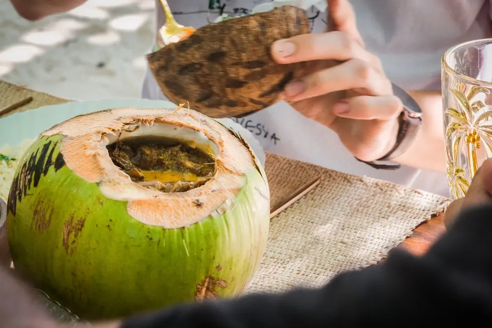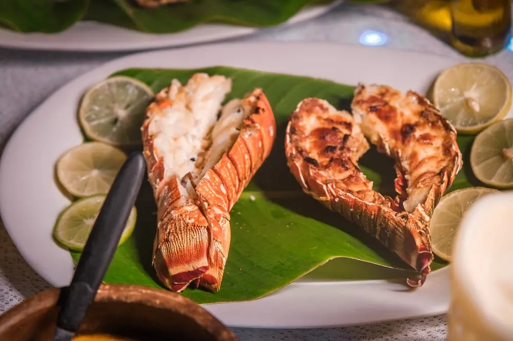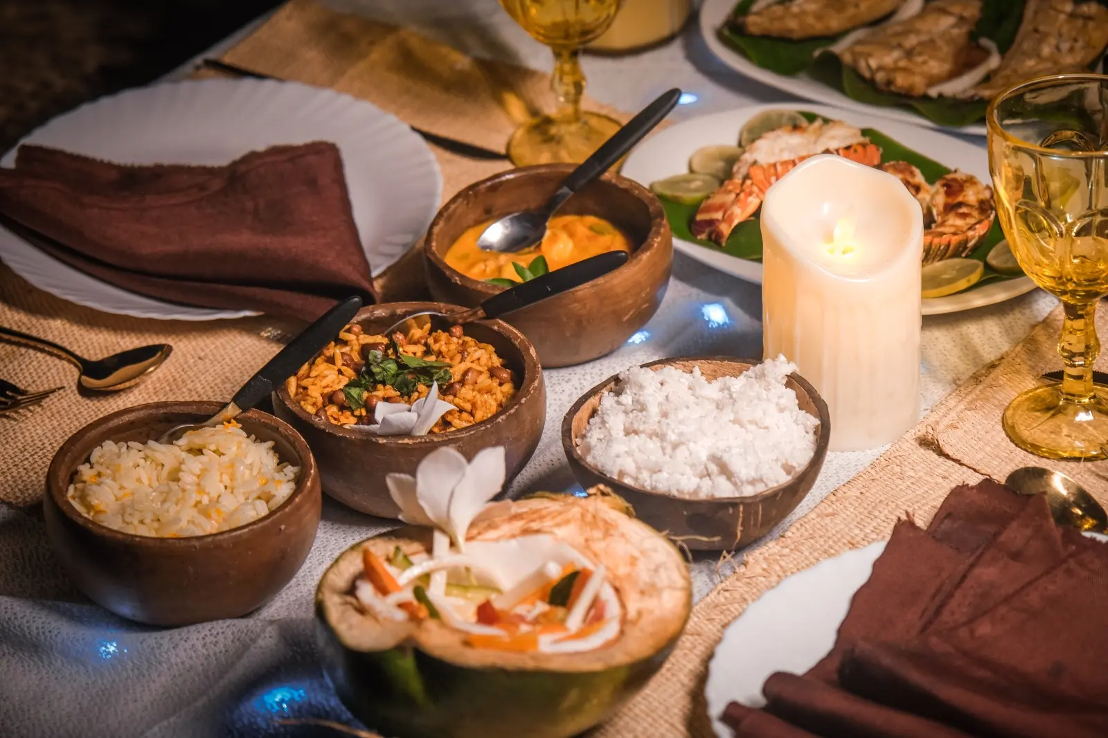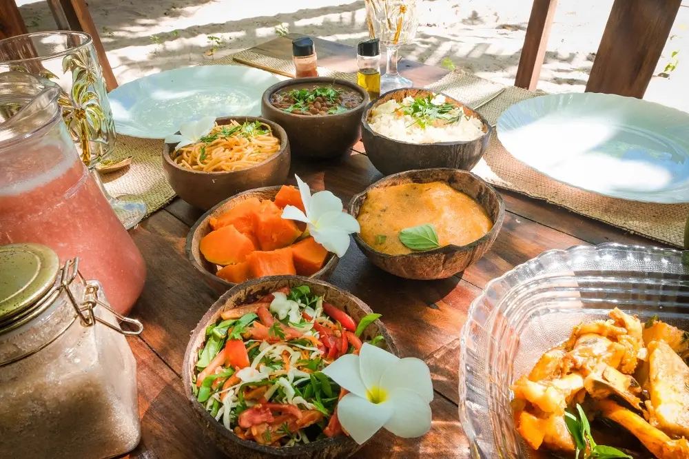 Peixe e lagosta grelhados, camarão ao leite de coco, purê de macaxeira, baião de coco, arroz, grolado – super típico de Caetanos, espécie de tapioca mexida, bastante macio –, entre outras opções, podem ser degustadas como prato principal. Na entrada, ceviche de coco verde, espetinho e tempura de camarão (camarão com legumes da região e molho cremoso, fritado rapidamente no óleo de coco natural) e demais possibilidades engrandecem o momento.