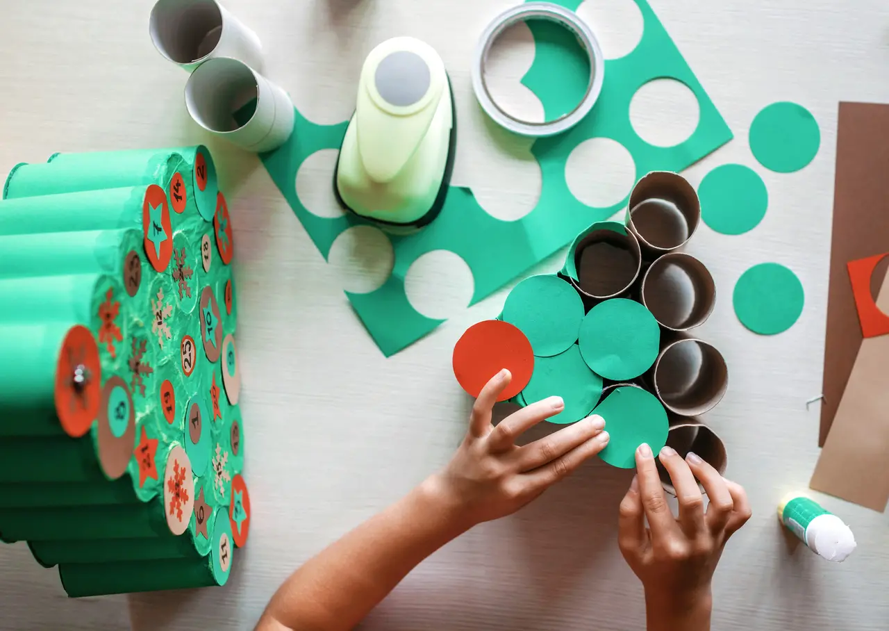 Uma sugestão é fazer o calendário com rolos de papel higiênico e papelão e uma cartolina. A ideia aqui é empilhar os rolos formando um triângulo, simulando uma árvore de Natal. Por trás, colar um papelão para fazer um fundo e colocar o que deseja em cada espaço.