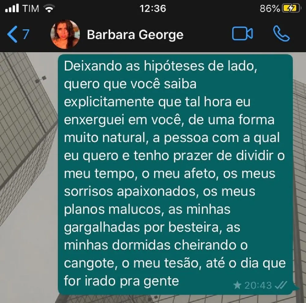 Assim, a vontade de se falar mais e estar perto foi aumentando e os dois seguiram respeitando o tempo de cada um. Logo que começou o período de quarentena, contudo, os encontros presenciais foram substituídos por uma maior adesão às conversas via WhatsApp – regadas, segundo Bárbara, a muitos áudios, mensagens, stickers e fotos.