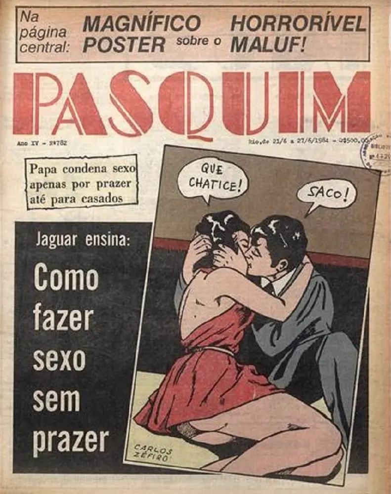 Referência da charge no Brasil, prezava pelo humor textual e gráfico, com capas que agregavam chamadas e ilustrações. "Jaguar ensina: como fazer sexo sem prazer" é um dos exemplos de manchete do Pasquim, publicada em uma das edições de junho de 1984.