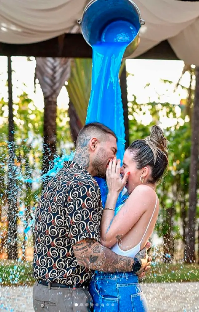 Lucas Lucco, 29, e Lorena Carvalho, 27, reuniram alguns familiares neste sábado (3) para o chá revelação do primeiro filho do casal. As bexigas, docinhos e o bolo em tons de azul e rosa decoravam o ambiente, mas na hora de descobrir o sexo do bebê, eles ousaram: ficaram embaixo de um balde que derramou tinta sobre os dois na cor azul, levando à descoberta que esperam um menino.