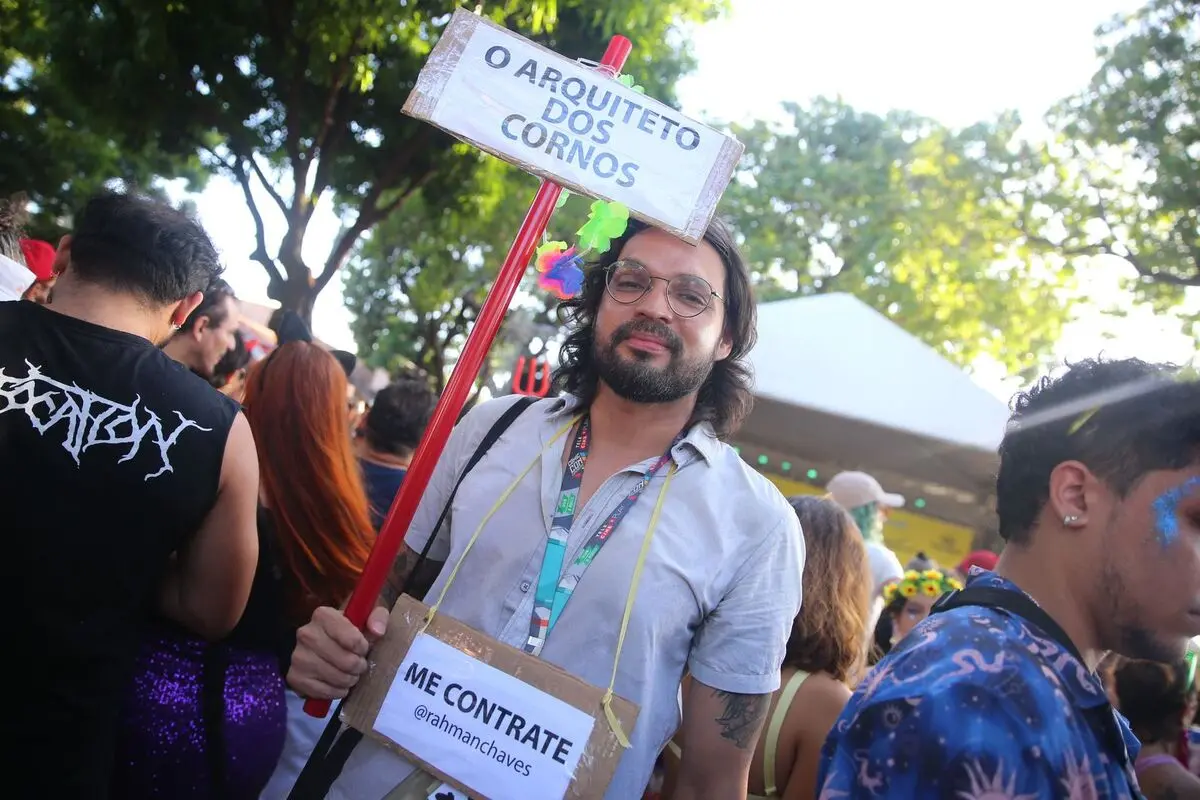 Com esse bom humor, ele também aproveitou para entregar os cartões com o endereço do Instagram profissional para divulgar o trabalho. Além da plaquinha com a frase “Arquiteto dos cornos”, ele carregava outra dizendo: “contrate-me”.