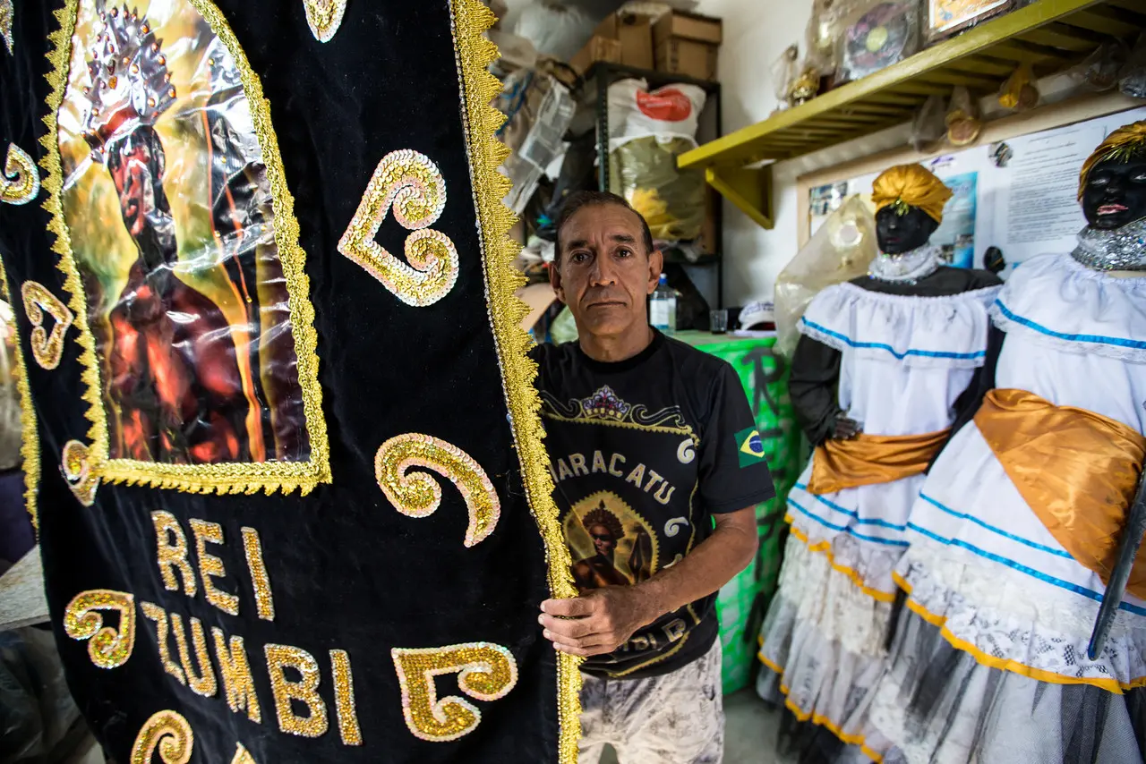 “Fomos pra Avenida tensos, mas foi uma emoção muito grande, chorei, porque não estava acreditando que estava ali de novo”, declara Teonildo de Assis Lima, presidente do Maracatu Rei Zumbi e carnavalesco há mais de 20 anos.