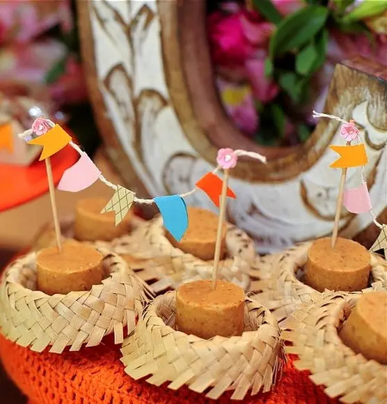 Minichapéus de palha podem ser utilizados na mesa, na decoração ou em brincadeiras. Na mesa, de cabeça para baixo, podem comportar quitutes. Vale decorá-los com fitas, guardanapos coloridos, folhas e flores secas ou deixá-los sem adorno. Na decoração, podem ser colados na parede com fita dupla face ou crepe, junto com bandeirinhas, frisa a profissional.