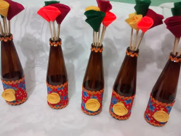 Não faltam alternativas para enfeitar a garrafa de vidro, queridinha da ambientação: pintada, decorada com fitas, tecidos, barbantes ou guardanapos coloridos, acompanhada de flores ou adornos de feltro em ponta de palito de churrasco. Versáteis, as garrafas de vidro são um mimo na decoração. Para pintá-las, a visual merchandiser recomenda tinta acrílica ou spray.