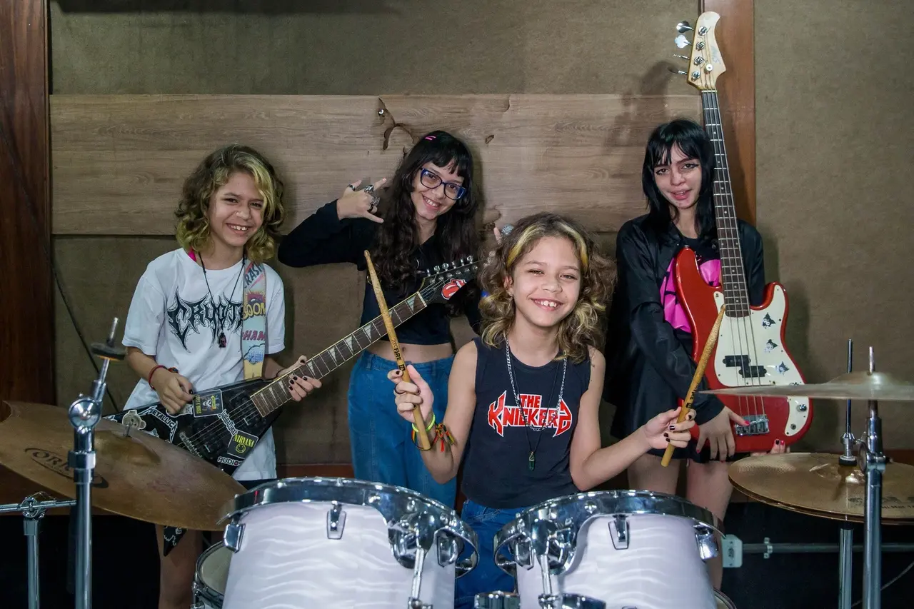 Ter uma banda é um sonho compartilhado por muitas crianças e adolescentes, de diversas gerações. Porém, tirar esse sonho do papel – aprender a tocar, descobrir referências, construir repertório e, por fim, subir no palco – exige tempo e energia. Por isso, quando perceberam que as filhas começavam a se interessar pelos instrumentos musicais da casa, os músicos Tina Paulo e Felipe Ferreira trataram de levar a brincadeira a sério, estimulando cada passo das pequenas Gaia Moon e Maya Love, de 9 anos, com atenção e leveza.