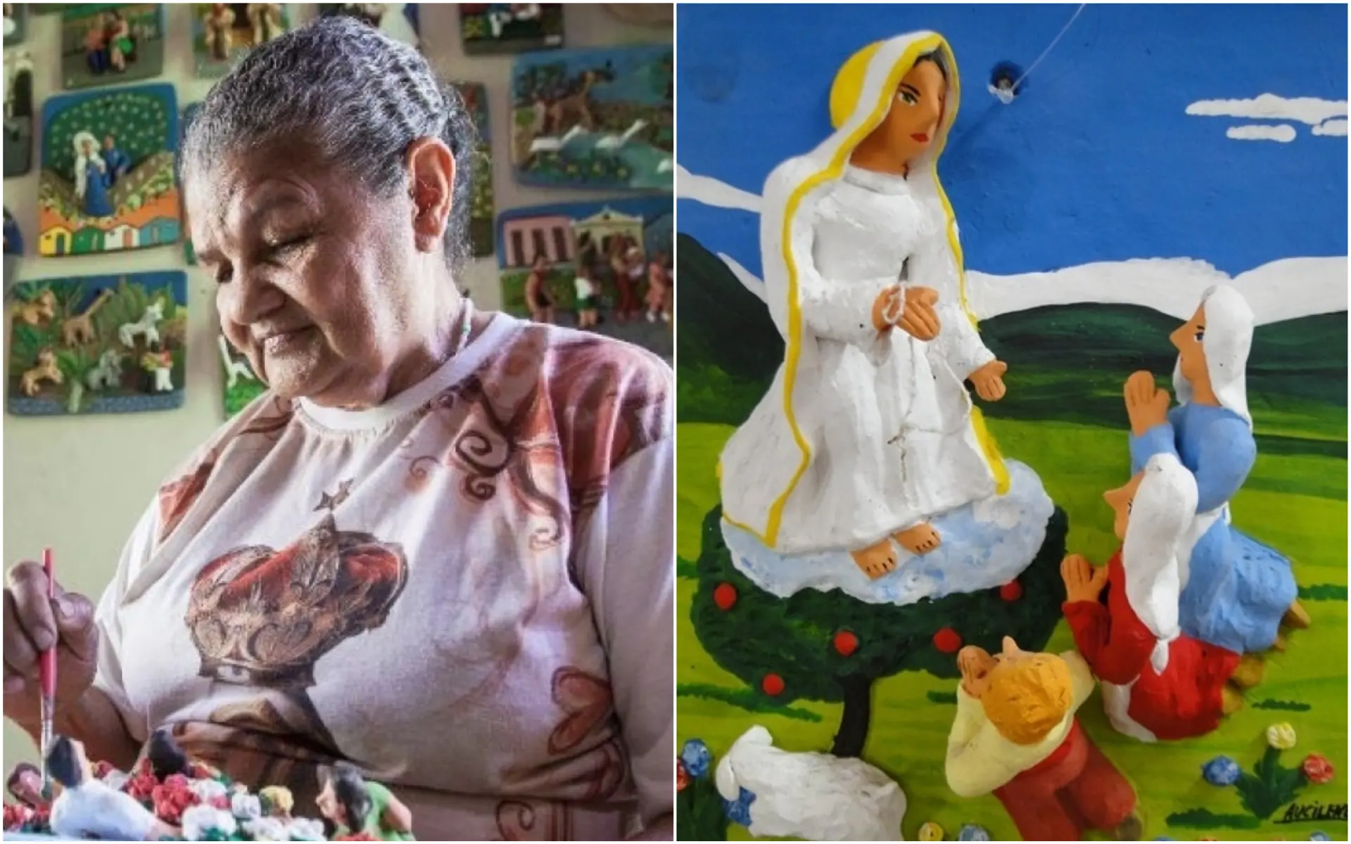 Matriarca da família Cândido, Maria de Lourdes confecciona placas e esculturas de barro com figuras regionais. Faz isso há mais de 50 anos. As peças trazem representações da cultura popular, como o reisado, o pau da bandeira de Santo Antônio, as bandas cabaçais e temas do cotidiano do Cariri. O material é produzido por ela e outras seis parentes.