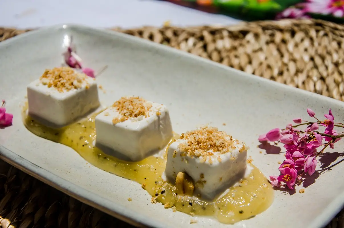 Tortinha gelada de coco verde com geleia de casca de maracujá e farofinha de pão amanhecido