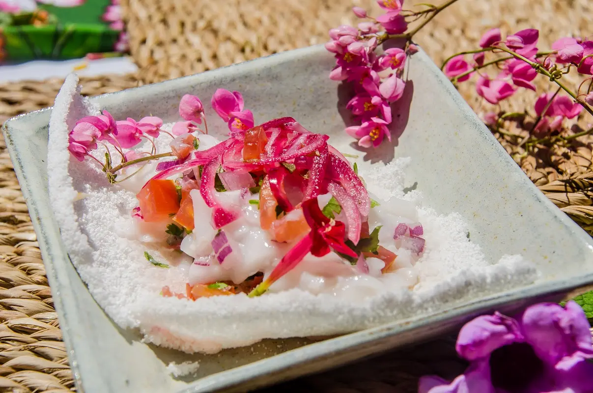 Em uma frigideira, peneire a goma da tapioca e leve ao fogo até que fique seca e quebradiça. Tire do fogo e reserve. Misture a cebola roxa com ⅓ copo de suco de limão, sal e melado, reserve. Em outro pote, misture o coco verde, o resto do limão, o tomate e o coentro. Sirva o ceviche na tapioca crocante com as cebolas por cima.