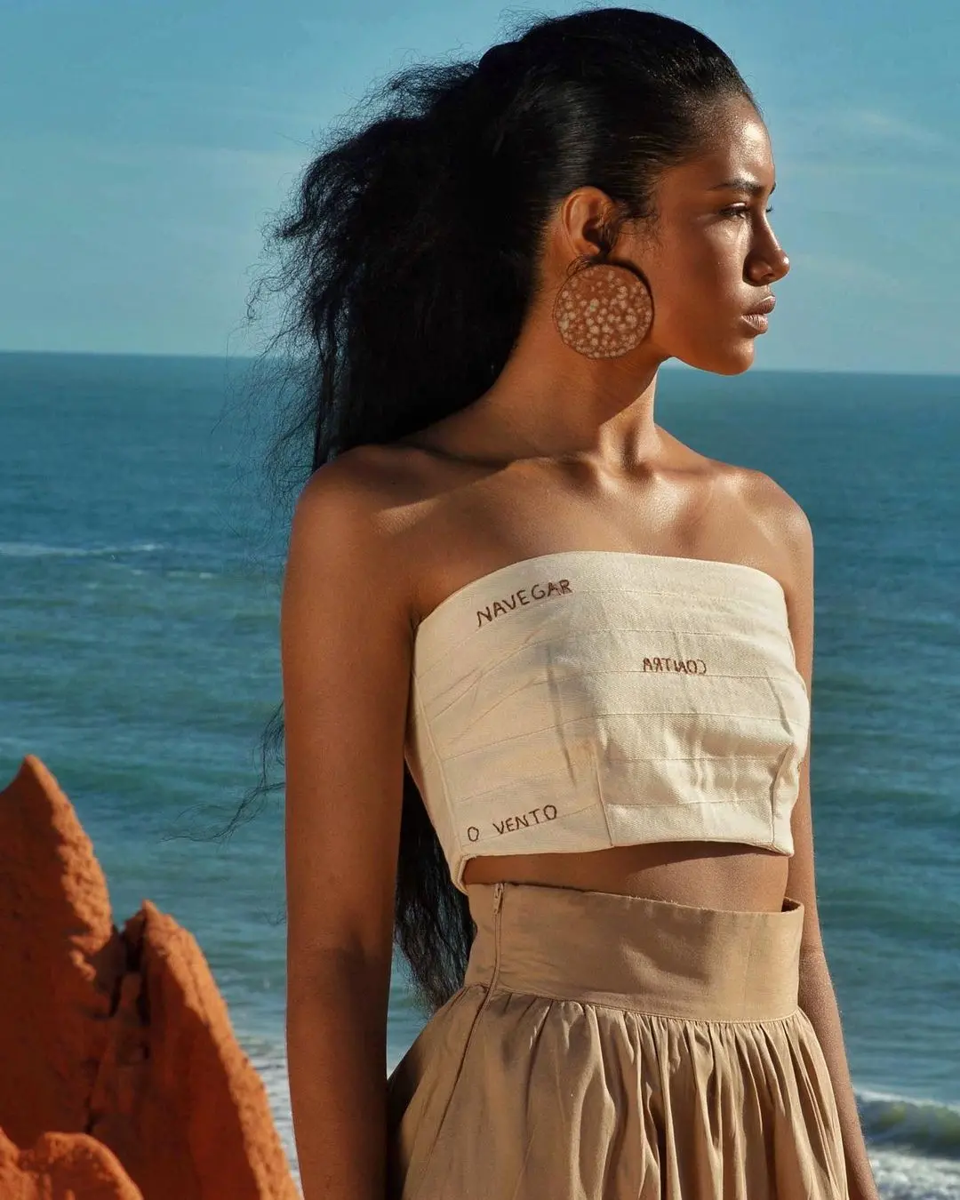“A gente trabalha com muitas frases que são bordadas à mão nas peças e algumas pessoas chamam de 'roupa poesia'. Usamos técnica de cerâmica feita por oleiros cearenses pra fazer botões, um vestido tem a alça com madeiras em bolas encapadas no tecido, que remete ao terço da minha vó”, detalha Marina sobre como aplica os elementos regionais.