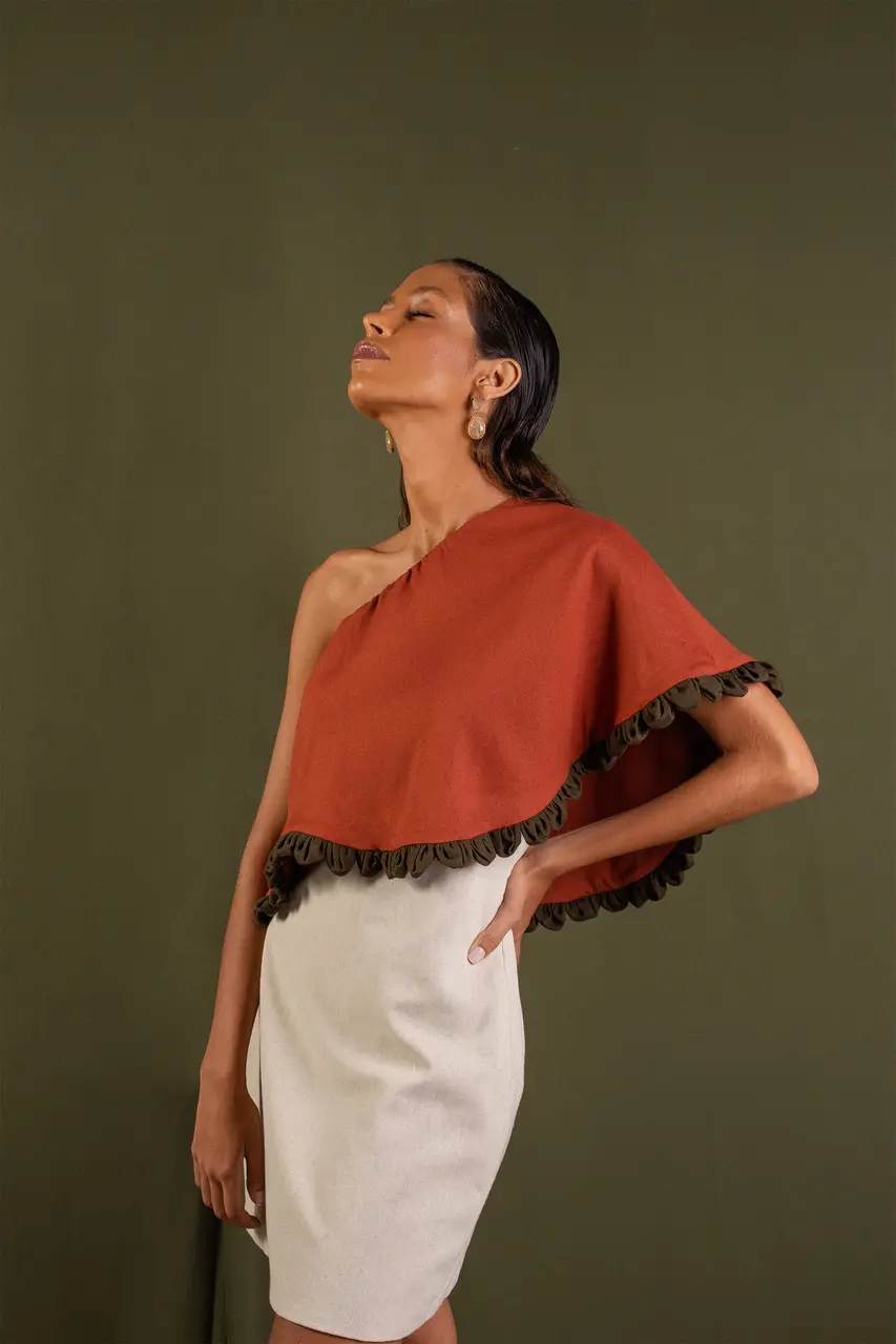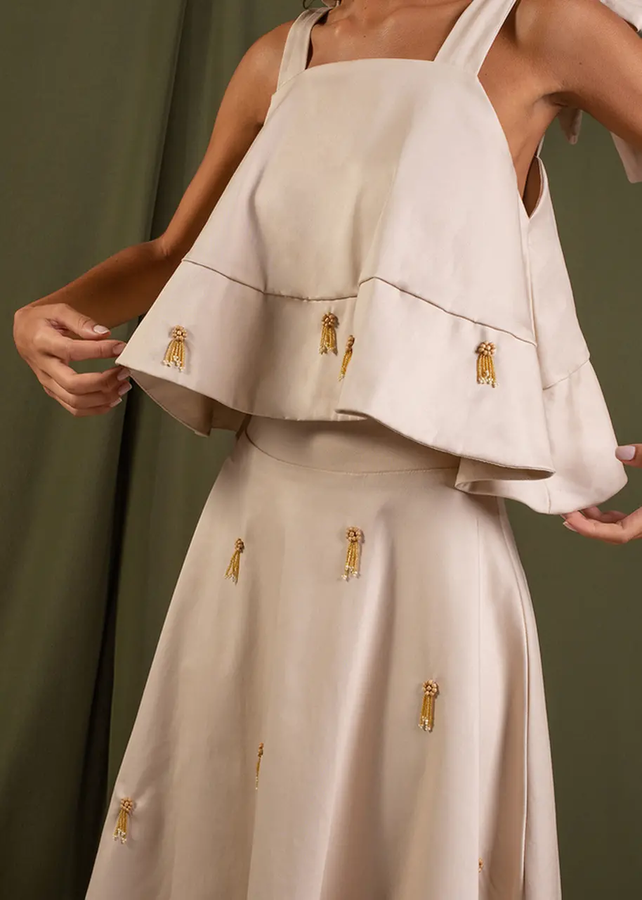 “Eu queria que a marca valorizasse a beleza de onde eu vi, de coisas que eu via no meu cotidiano, como a timbaúba. Na nova coleção, por exemplo, temos um vestido inspirado no pequi, que me traz uma referência muito grande da minha memória de infância. Fizemos um bordado manual com miçangas de vidro, inspirado no fruto”.