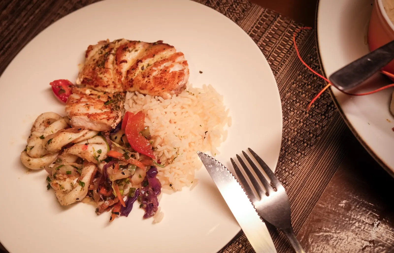 Após a entrada – Filé Mignon com Molho Gorgonzola – experimentamos o prato Frutos do mar com adicional de lagostas. Camarão, lula, polvo e as mencionadas lagostas chegam em aparência belíssima, num mix atraente. Cada insumo é grelhado e, ao término, acompanhado de legumes salteados e arroz. Quem detalha mais aspectos é o chef Matheus Viana.