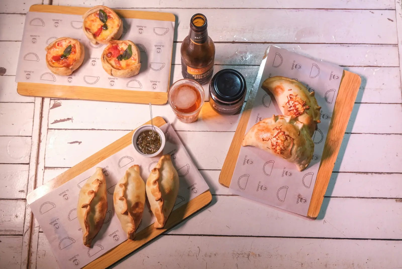 No total, são 16 sabores de empanadas, dos mais variados. Carne, Frango, Presunto e Queijo, Calabresa e Atum abrem a dianteira como as mais clássicas. A criatividade fica por conta sobretudo de opções como Caprese, Carne Suína, Espinafre, Banana, Camarão, Romeu e Julieta, Cebola e Queijo e Nordestina.